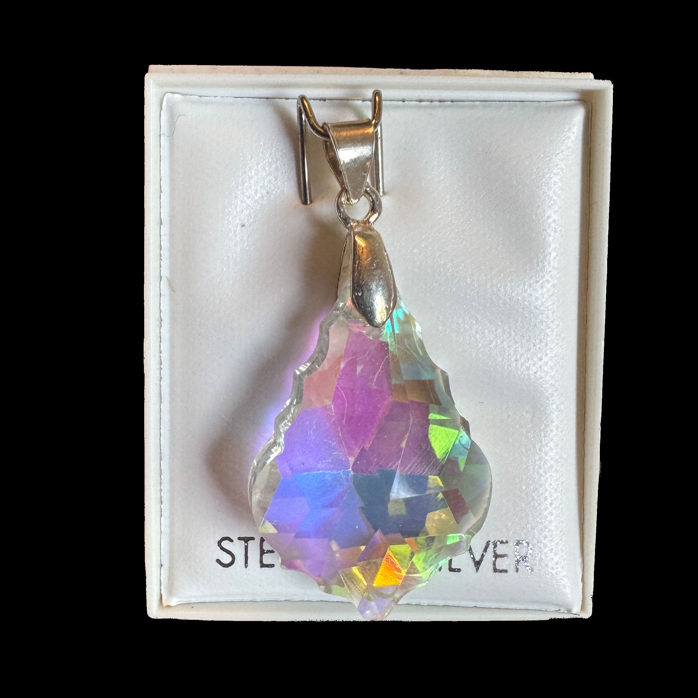 Cut in a faceted teardrop design, this pendant reflects a mesmerising spectrum of shifting colours — from soft lilacs and blues to flashes of gold and green — creating a radiant, ever-changing glow with every movement.