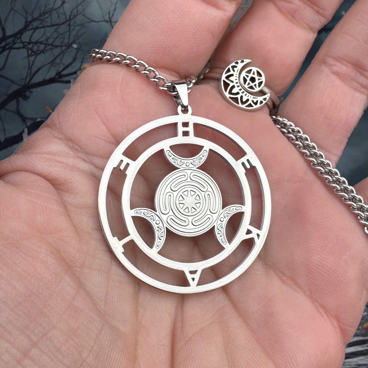 Crafted in stainless steel and suspended from a 20-inch chain, this striking pendant honours the goddess Hekate with an intricate strophalus at its heart, a sacred labyrinth symbol tied to Her mysteries, Her torches, and the turning of fate. Encircled by the Triple Moon, this pendant serves as a protective ward, a key to the liminal, and a beacon to all who walk the crossroads.