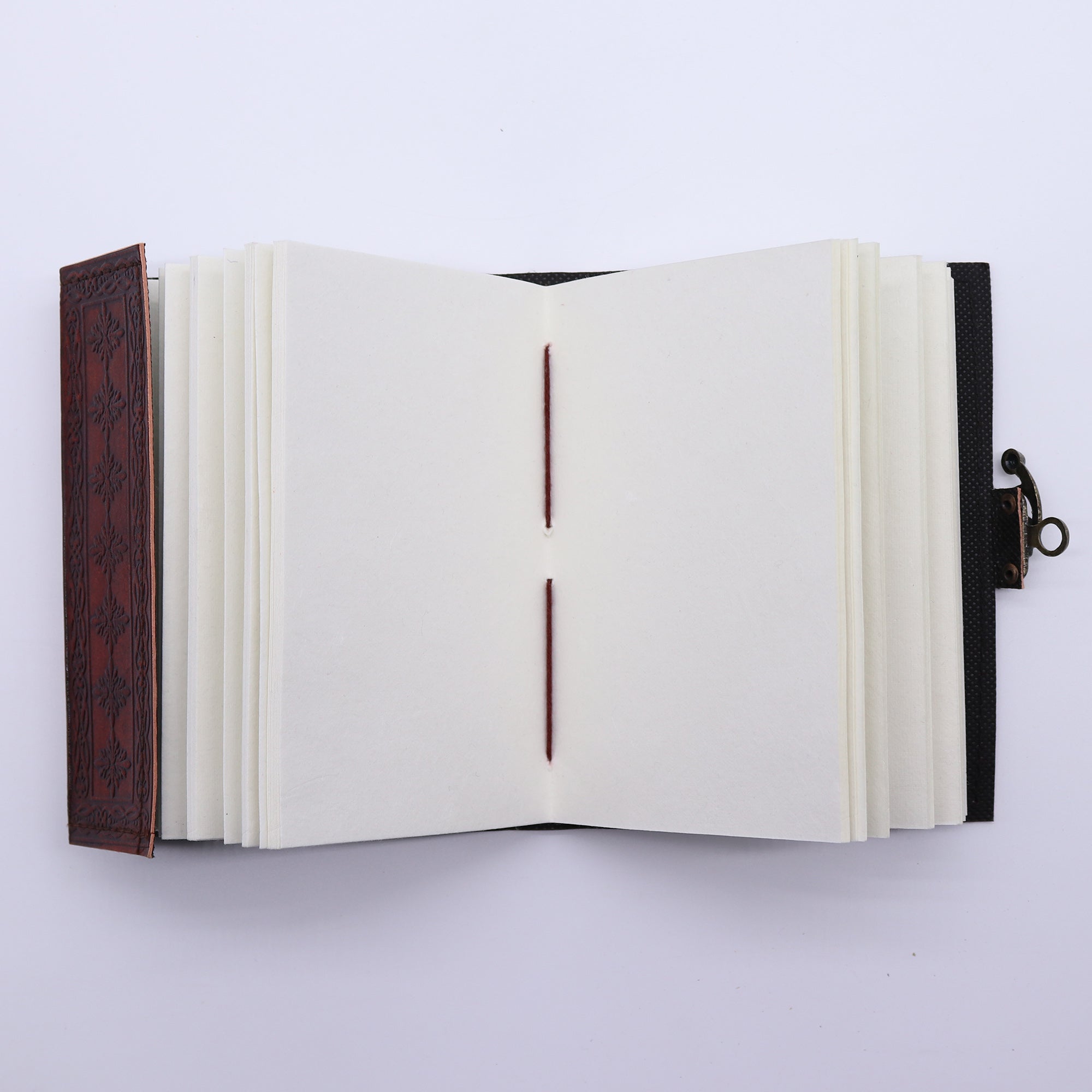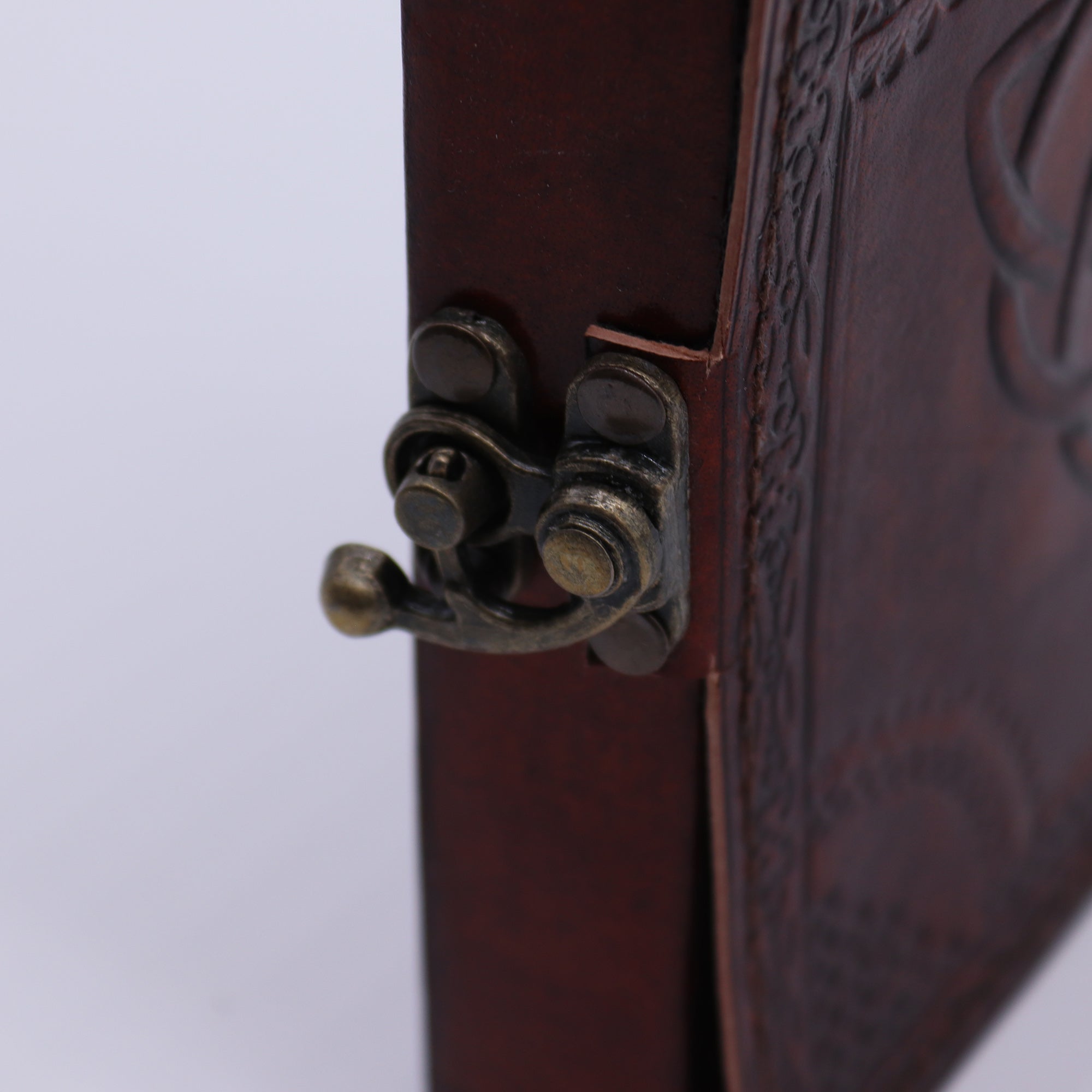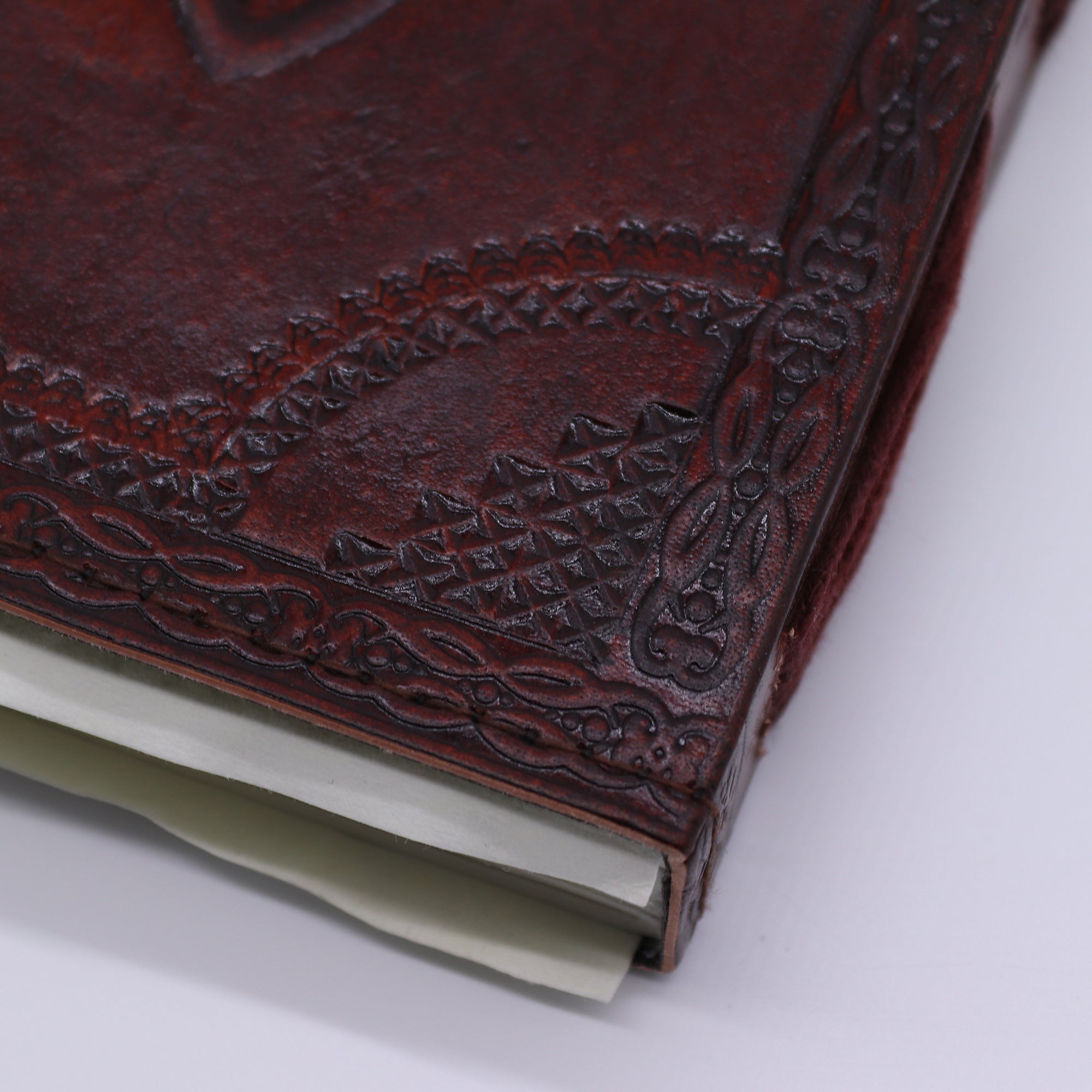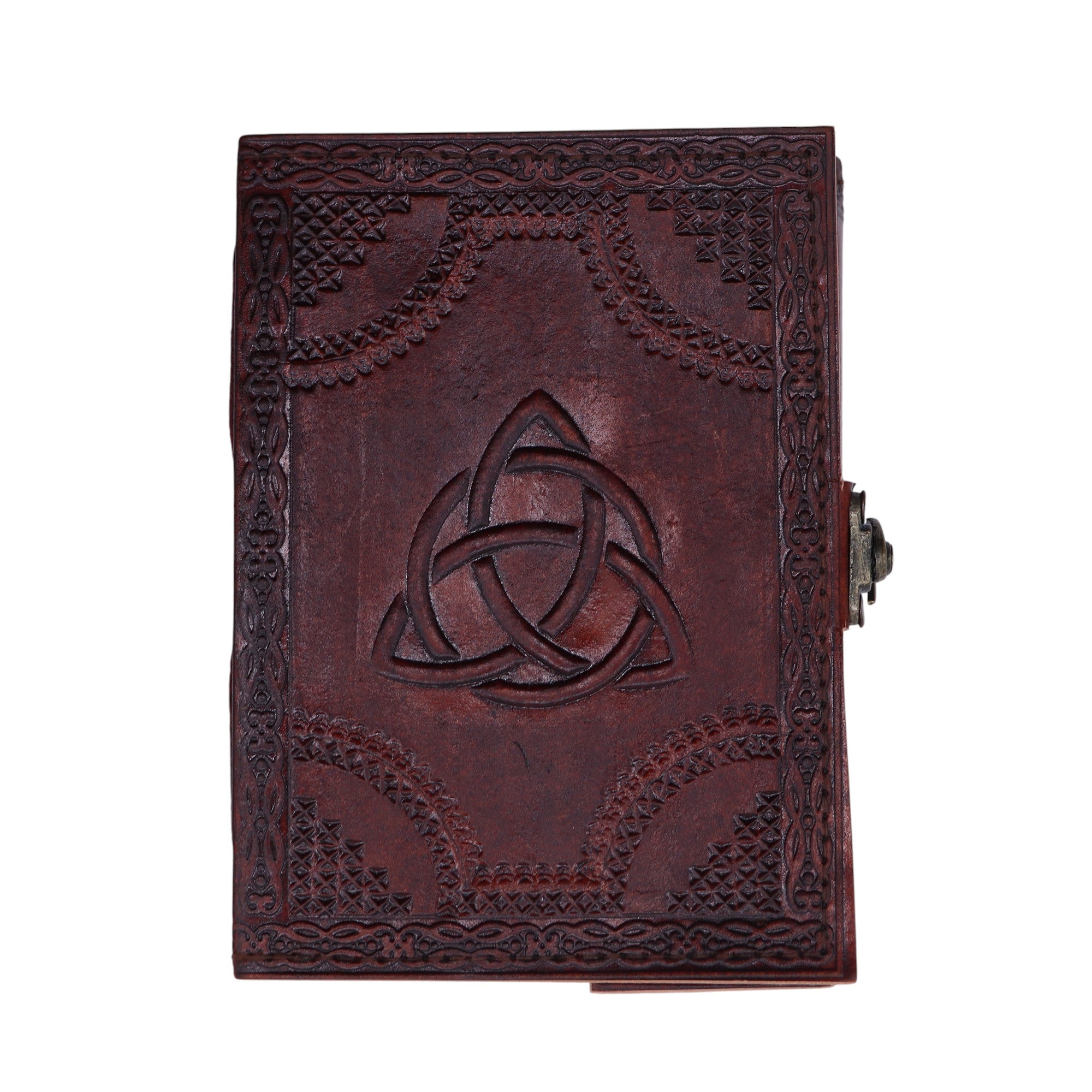 A mystical canvas for seekers of ancient wisdom and magical insights. This Deep Red Tan leather journal features a carefully crafted arcane design with embossed Triquetra detail, making this tome an essential addition to any witch's book case.