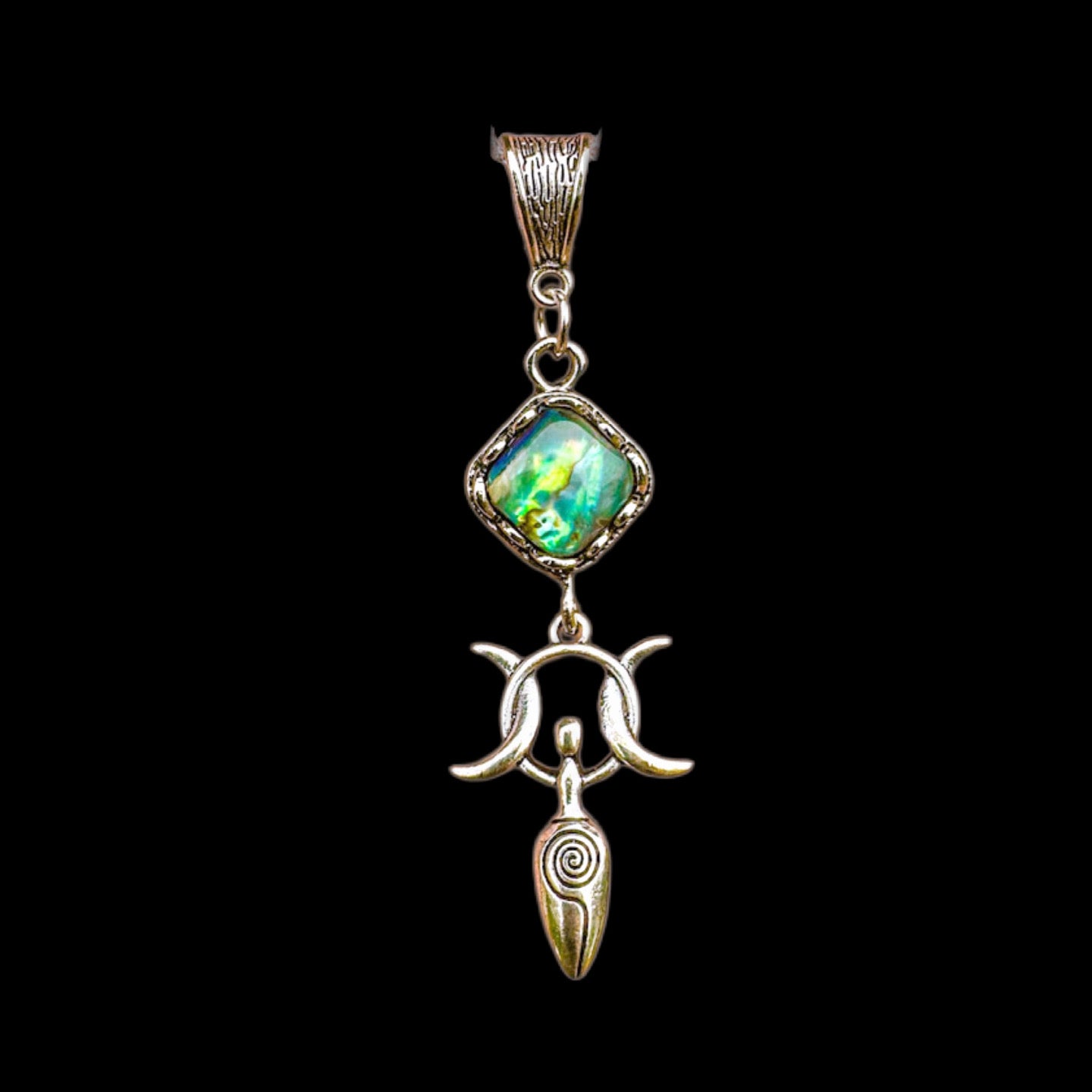 Suspended beneath the stone is a triple goddess symbol and goddess figure, representing the Maiden, Mother, and Crone, a timeless emblem of strength, wisdom, and cyclical transformation.