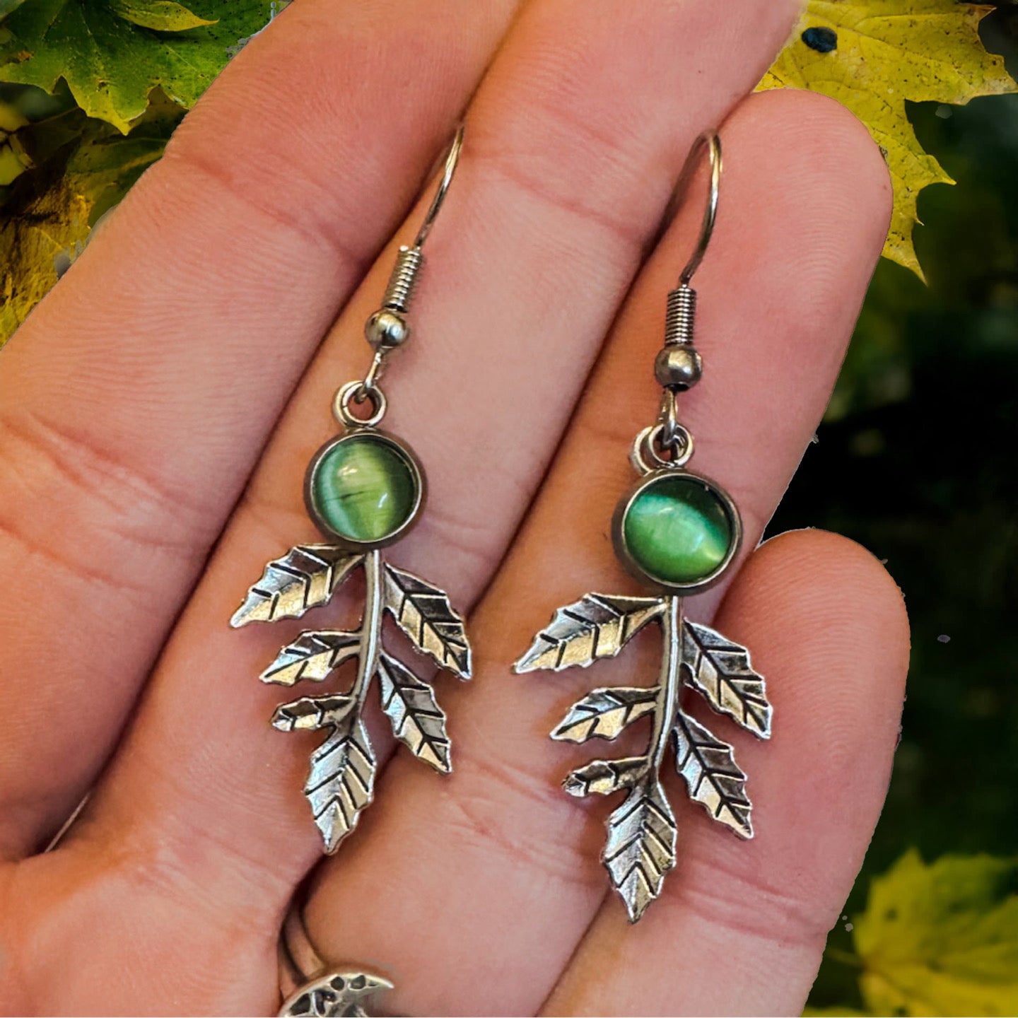 These pretty earrings feature detailed silver plated leafy branch charms featuring detailed leaves and green cats eye crystal cabochon dangling charms fitted to hypoallergenic surgical steel fish hook earrings