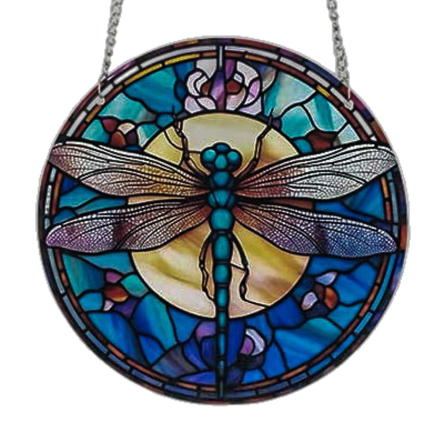 Acrylic disc sun catcher, measuring 15cm in diameter, featuring a vibrant dragonfly design. Comes with hanging chain attached.