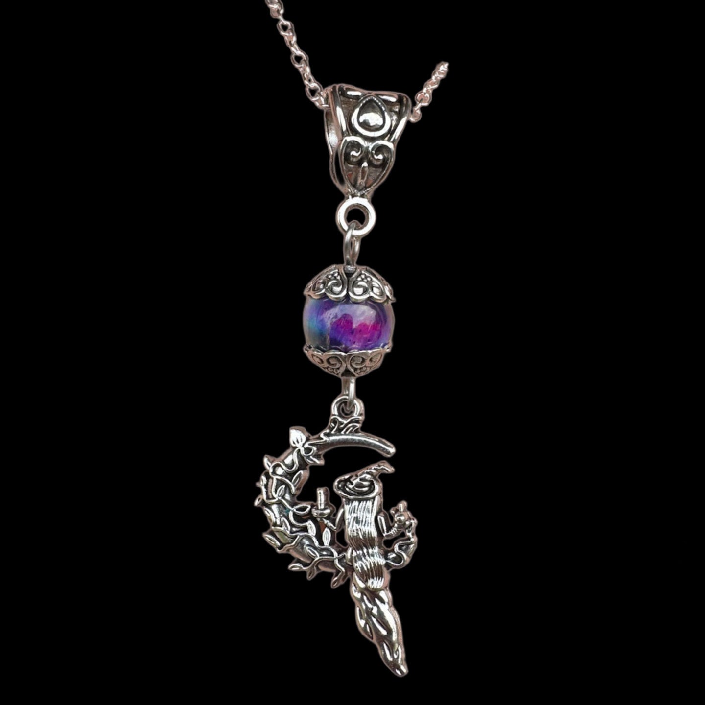 Step into the realm of magic and mystery with the Mystic Coven Necklace. This enchanting piece consists of a beautifully detailed charm featuring a witch sat inside the cradle of a crescent moon.