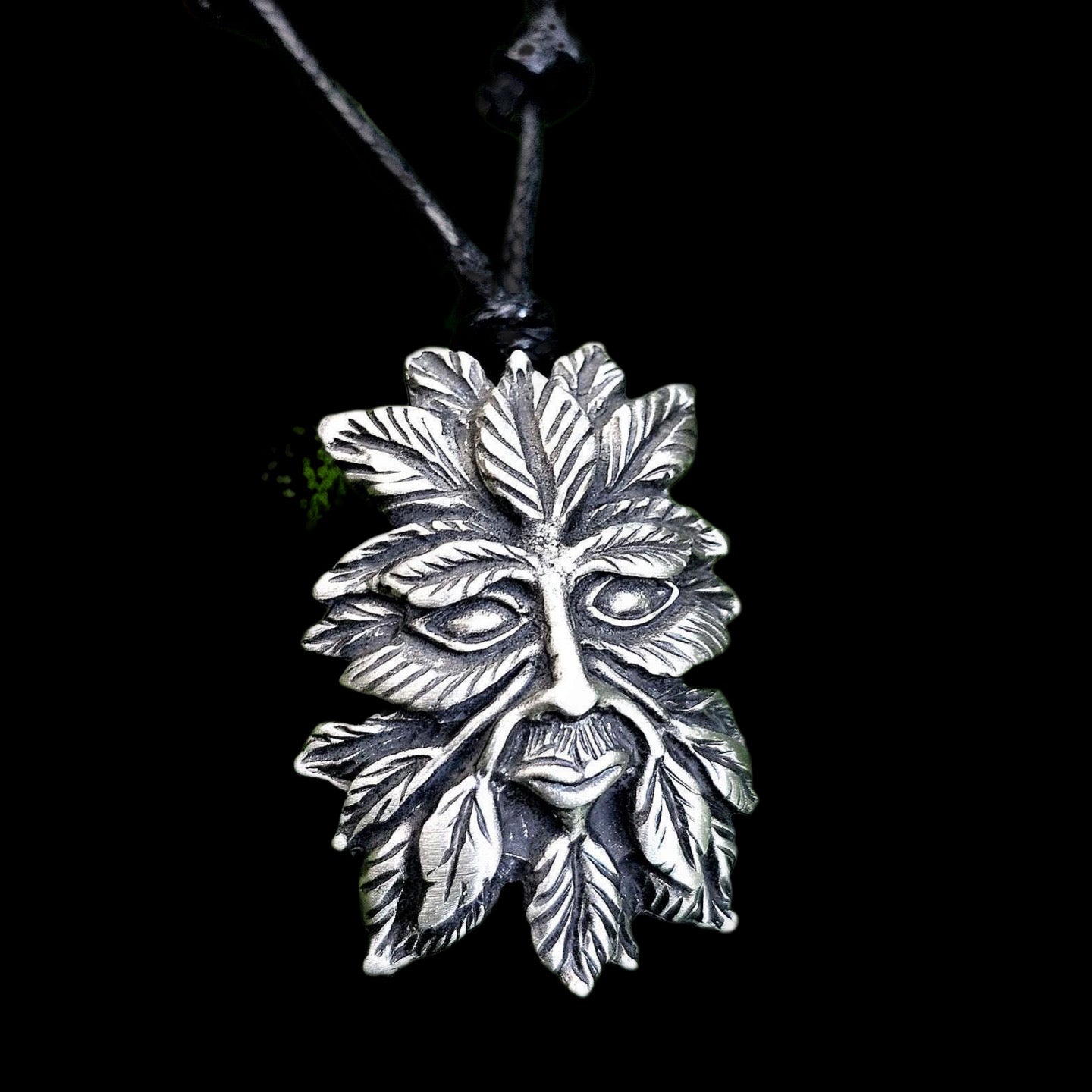 Green Man Pendant, cast from nickel free fine pewter. Fitted with an adjustable black cord necklace.