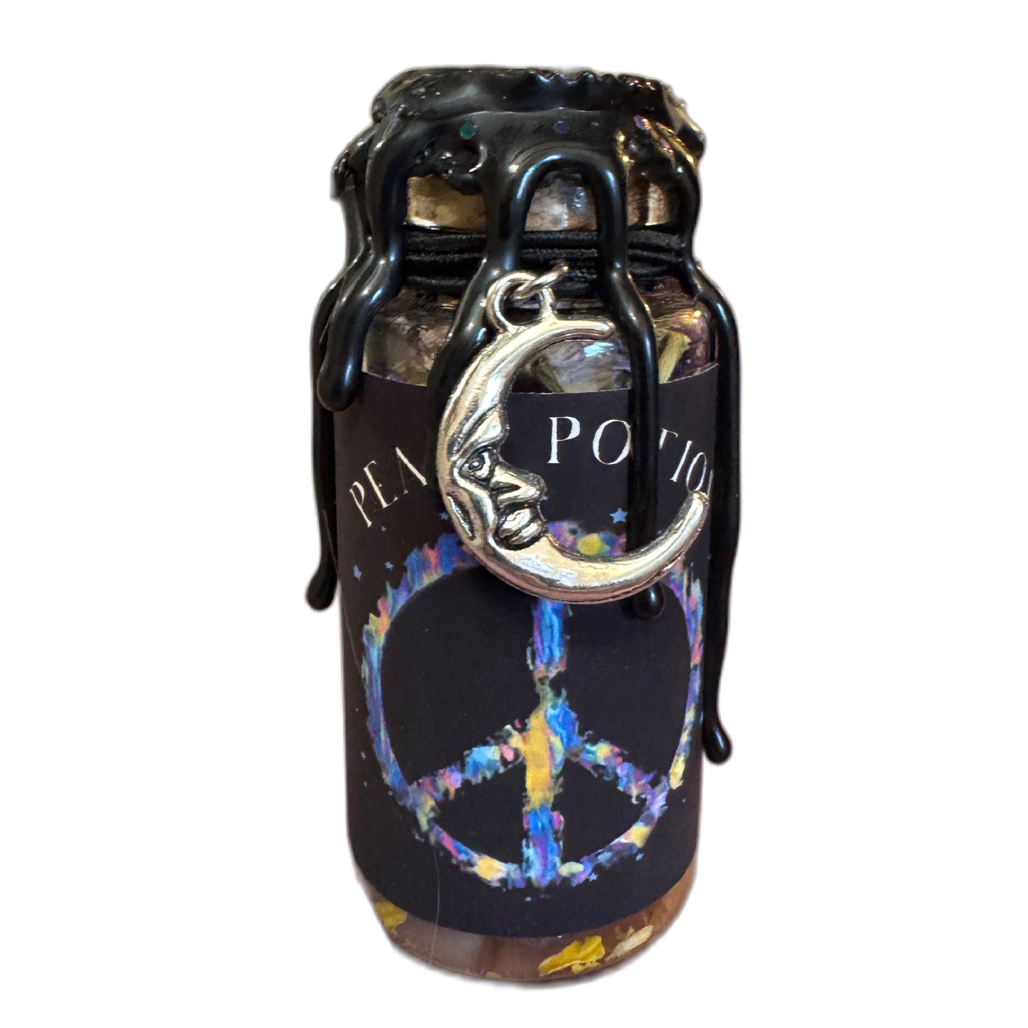 Each Peace Potion is lovingly prepared with intention and charged at the altar before being sealed and presented in a black drawstring pouch.