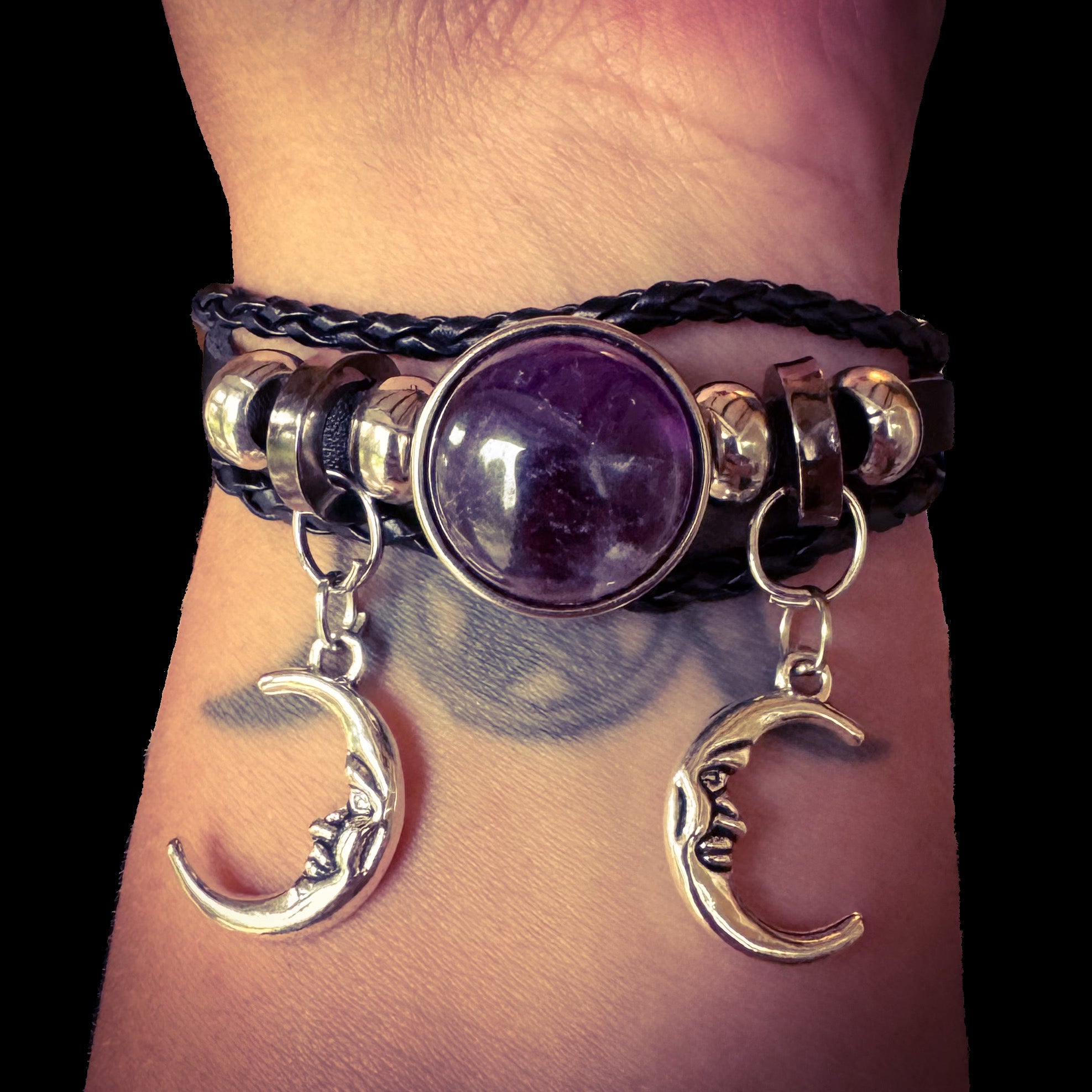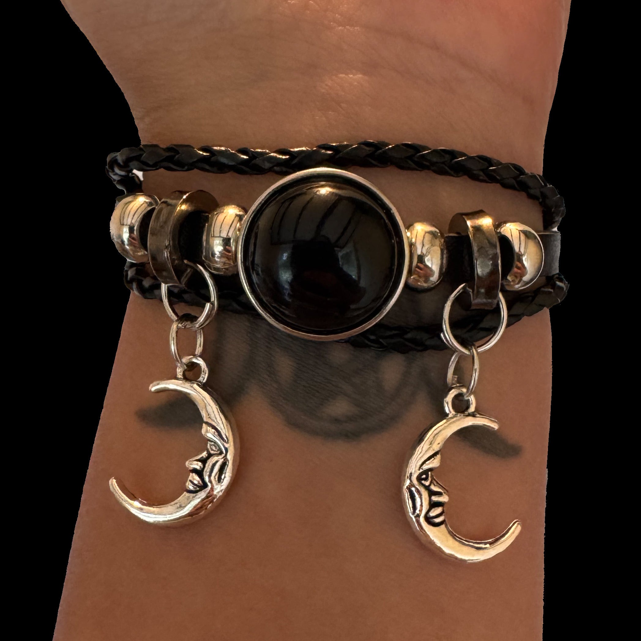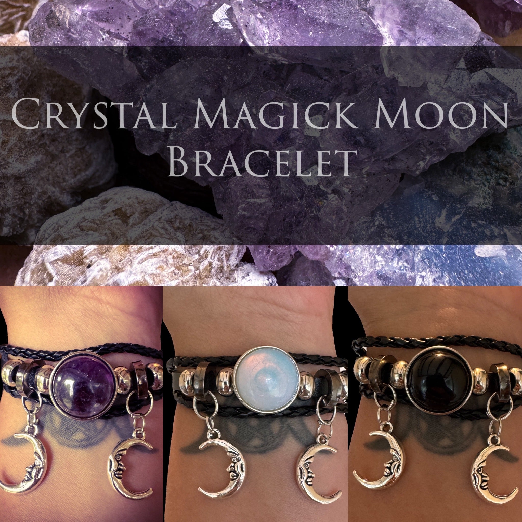 Celebrate the sacred cycle of the moon and the powerful energy of the divine feminine with the Crystal Magick Moon Bracelet. This adjustable leather bracelet is available in your choice of three enchanted crystal cabochons—Obsidian, Opalite, or Amethyst—each representing a different energetic path.