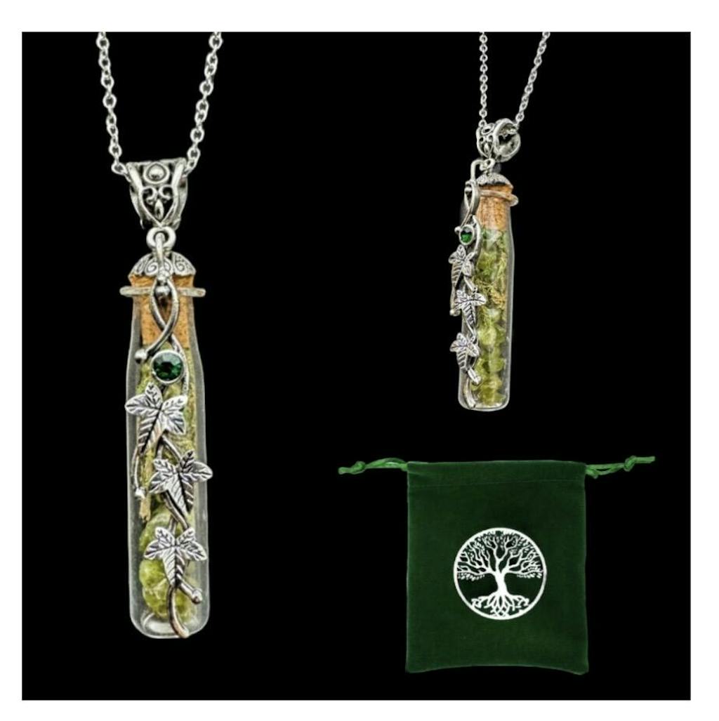 This WitchCrafted necklace features a glass cork topped vial containing real dried moss and peridot crystal chips. The vial features an ornate filigree silver cap and a silver plated vine of downward cascading ivy leaves down the length of the bottle. At the top of the vine is an inset faceted deep green cabochon. Fitted to a 20 inch stainless steel chain